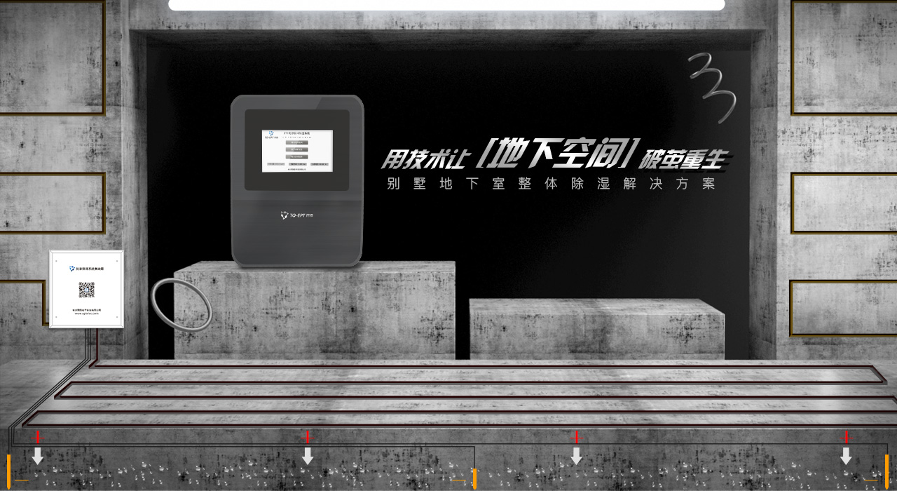 別墅地下室總有霉味的根源找到后,最好的方法是安裝電滲脈沖抗?jié)B除濕系統(tǒng),TQ-EPT簡單來說就是通過室內(nèi)的主機控制部分,在室內(nèi)墻壁地面布置的正極與室外土壤里的負極之間產(chǎn)生特定頻率的脈沖,將水分子定向排列引導至室外。